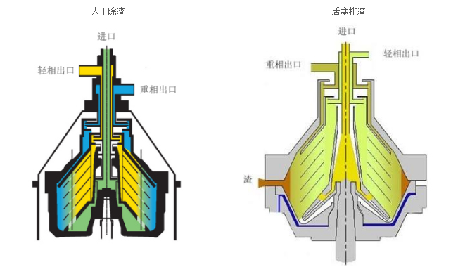 電機(jī)通過螺旋齒輪副驅(qū)動轉(zhuǎn)鼓繞主軸軸線做高速旋轉(zhuǎn),在轉(zhuǎn)鼓內(nèi)形成強(qiáng)大的離心力場。物料由上部中心進(jìn)料管流入轉(zhuǎn)鼓底部,通過碟片分流孔趨向轉(zhuǎn)鼓壁空間。在離心力作用下,輕液沿錐形碟片外錐面向軸心流動至上部由輕液口排出。重液沿碟片內(nèi)錐面趨向轉(zhuǎn)鼓壁流動至上部的重液口排出。比液相重的固相物沉積向轉(zhuǎn)鼓內(nèi)壁形成沉渣,由排渣裝置自動排出機(jī)外或停機(jī)后由人工清除。
